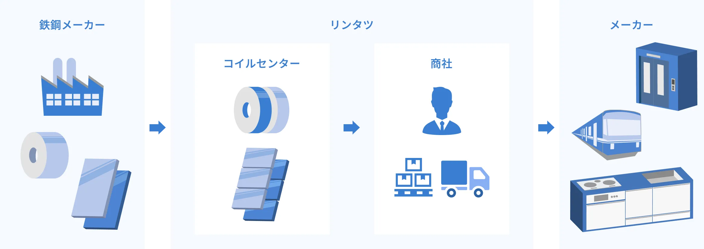 ステンレス業界では、さまざまな企業が役割を分担して製品を届けています。まず、鉄鋼メーカーがステンレスそのものを生産。次に、コイルセンターなどが、用途に合わせて素材を切断・加工します。その後、商社や流通業者がステンレス製品を製造する企業などに供給し、最終的に自動車やエレベーター、鉄道などの完成品に組み込まれます。